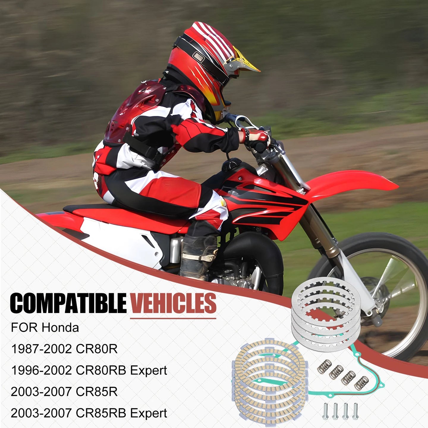 Description: Enhance the performance of your Honda CR80RB Expert with our premium clutch friction steel plates, gasket, and bolts. Designed specifically for model years 1996 to 2002, this comprehensive kit ensures optimal clutch engagement and durability. The high-quality materials used in these components provide improved heat resistance and longevity, making them ideal for both casual riders and competitive racers. Experience smoother gear shifts and enhanced power transfer, allowing you to maximize your bike's performance on the track or trail.